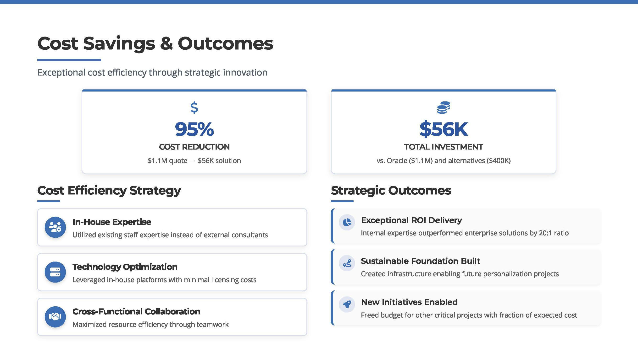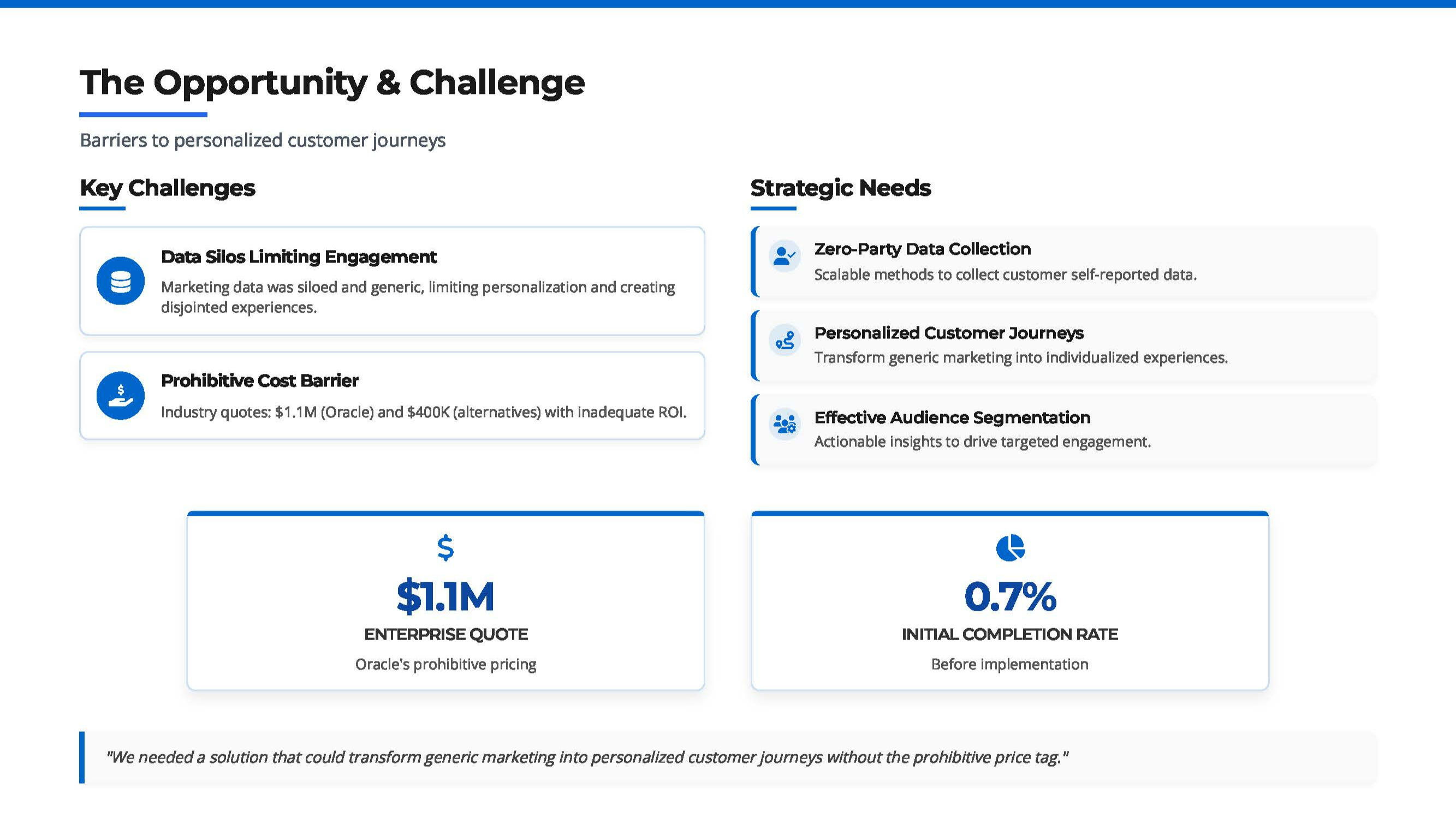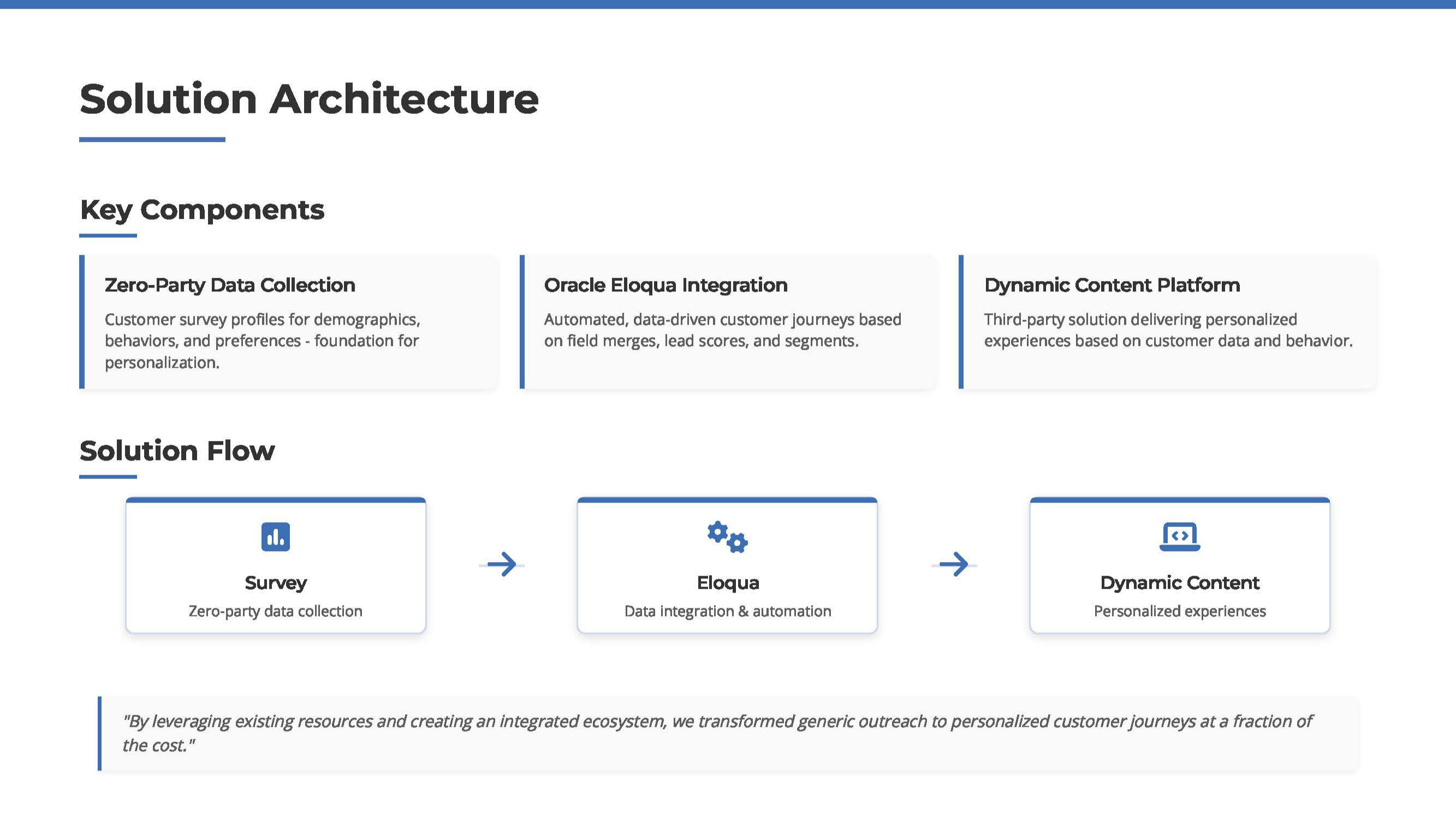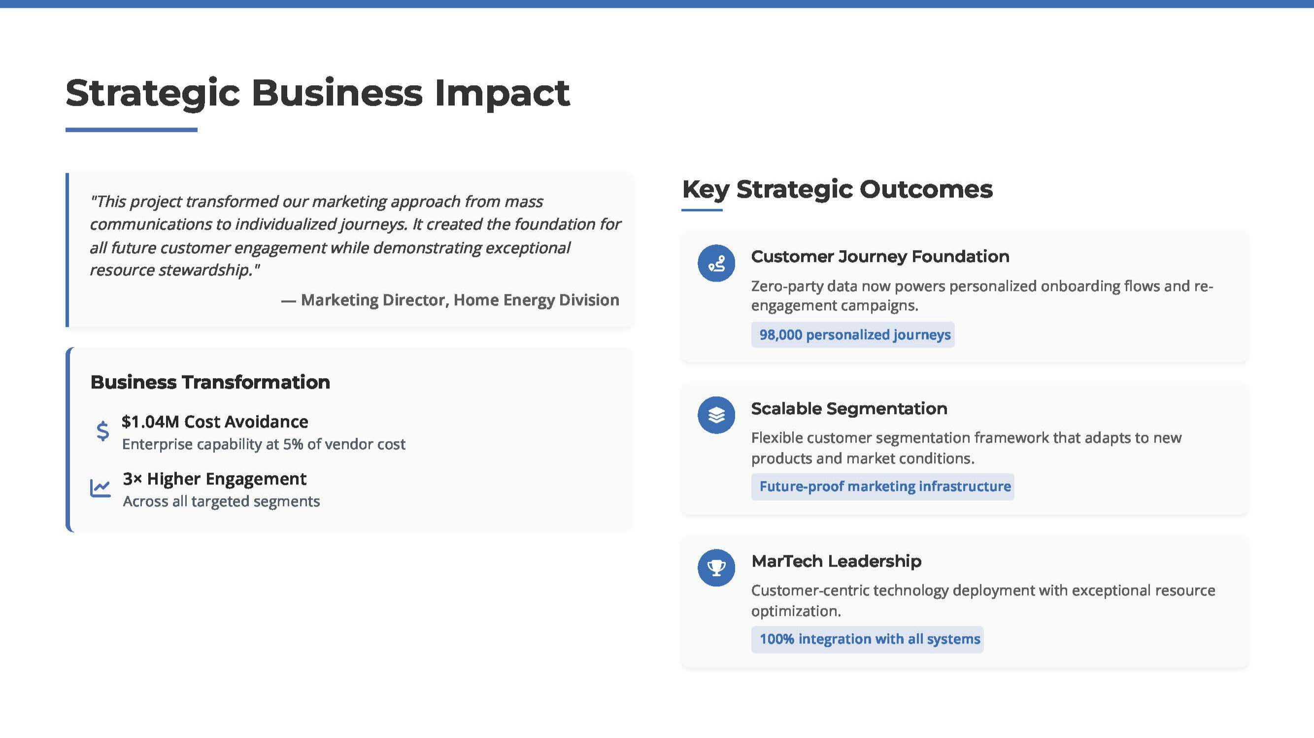 This portfolio showcases the marketing technology systems I have architected and operated across enterprise environments, with a focus on measurable outcomes, reliability, and governance. Each case study documents the chain from customer data and identity through orchestration, QA, monitoring, and reporting, including integration diagrams, build decisions, and quantified results. The goal is paved-road lifecycle infrastructure that scales, protects consent and deliverability, and turns journeys into accountable revenue outcomes.